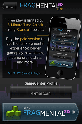 Fragmental 3D Lite – 3 Boyutlu Tetris Oyunu bir çok oyun gibi game center uyumlu. Yeni oyuna başlamadan game center profilinize giriş yapıyor. Ve ardından oyuna giriş yapabiliyorsunuz.