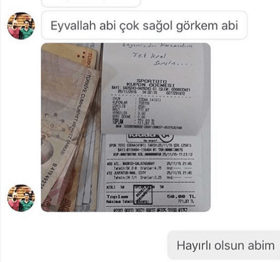 Malum, inandırıcı olması için de paralar üzerine kazandım, teşekkürler yazdıkları fotoğraflar atmayı da ihmal etmiyorlar. Aynı şekilde, sanki bunlardan maç satın almış da para kazanmış birisiyiş gibi kendi kendilerine teşekkür mesajları atıp ekran görüntülerini paylaşıyorlar. Bu tarz dolandırıcı hesaplara itibar etmeyin, paranızdan olmayın.