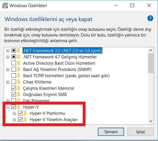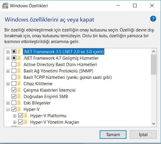 8- Windows özellikleri penceresi açılacak burdan Hyper-V’nin solunda bulunan artıya basıyoruz