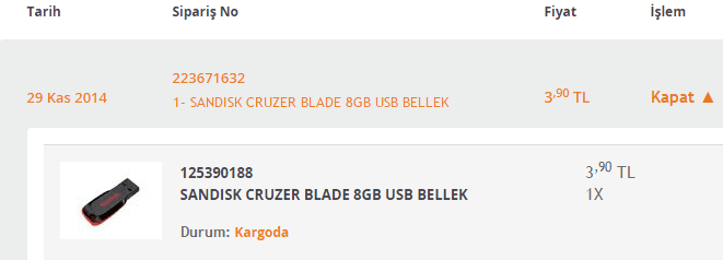Aslında pekçok konu var sipariş aşamasında dikkat çeken. Üye girişi yapıp siparişi kontrol ettiğimiz zaman ” Kargoda” ibaresini görüyoruz ancak sistemde takip numarası yer almıyor. Takip numarası UPS kargodan mail olarak size ulaştırılıyor. Gelen siparişlerimizde bu şekilde oldu ancak hala gelmeyen siparişimiz sistemde Kargoda yazdığı halde takip numarası iletemiyorlar. Konuyu Teknosa müşteri hizmetleri ile paylaştığımızda ise eticaret stoklarında tükendiği için mağazadan gönderdiklerini, çıkış yapılmış olarak gördüklerini, takip numarası ileteceklerini belirttiler. Araştırdığımızda gördük ki tek sorun yaşayan biz değiliz. Bu konu yine ekşisözlükte teknosa 4 liralık usb rezaleti başlığında paylaşılmış.